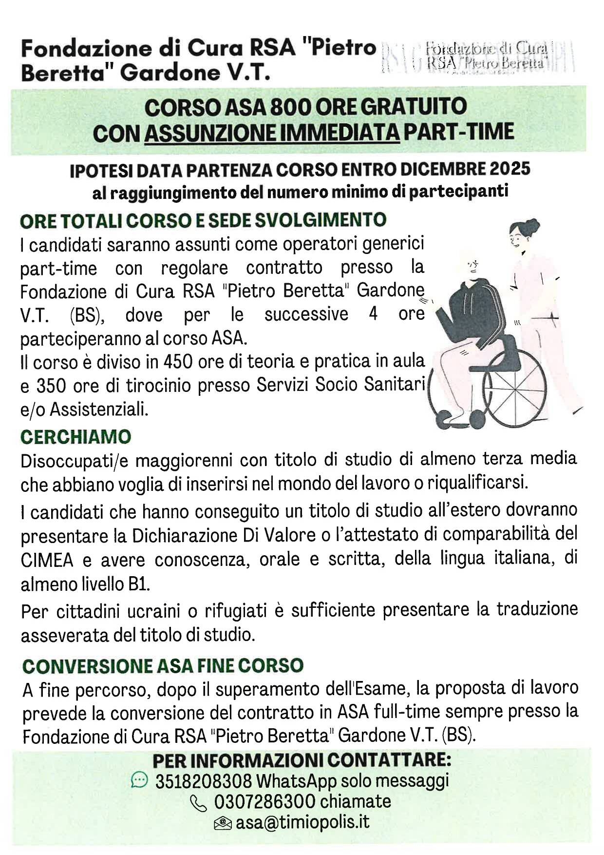 I candidati saranno assunti come operatori generici con regolare contratto presso la Fondazione di Cura RSA "Pietro Beretta" di Gardone Val Trompia, dove per le successive 4 ore parteciperanno al corso ASA.