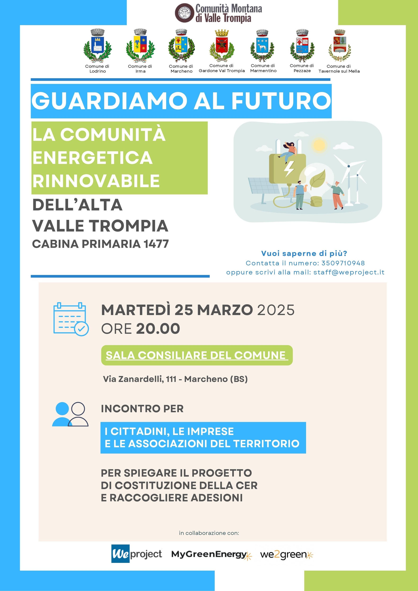 Il nostro Comune ha aderito alla Comunità Energetica Rinnovabile (CER) della Valle Trompia, relativamente alla cabina primaria 1477. Questa CER, insieme alla partecipazione di cittadini, PMI e associazioni del territorio, permetterà di produrre e condividere energia rinnovabile tra imprese, enti locali e famiglie. Un passo concreto verso un futuro più sostenibile, contribuendo alla riduzione dei costi energetici e alla tutela dell’ambiente.