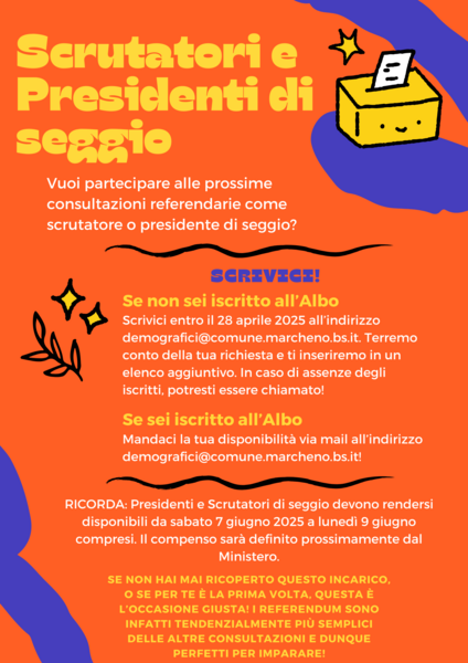 In vista delle prossime consultazioni referendarie, si chiede alla popolazione di dare la propria disponibilità a ricoprire il ruolo di scrutatore o presidente di seggio.