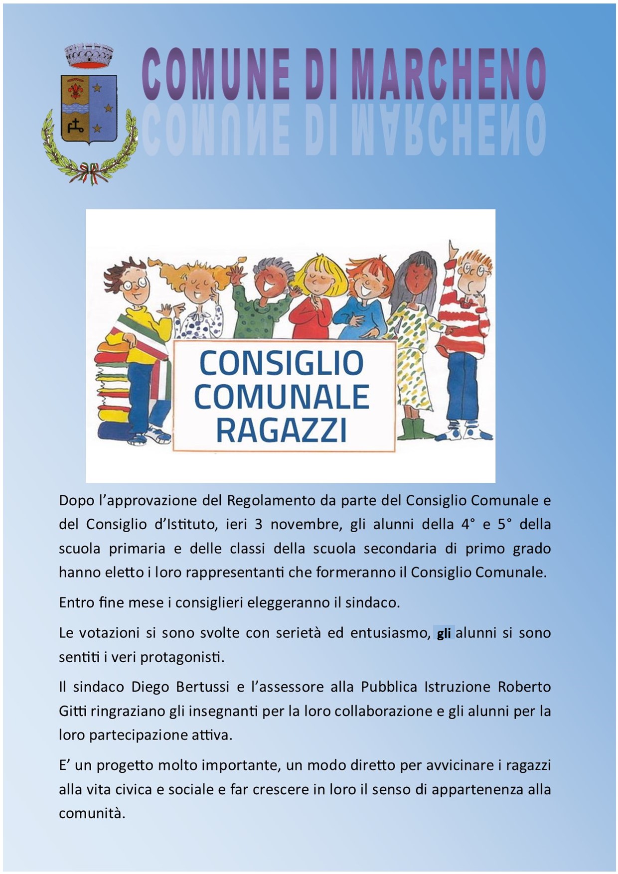 Dopo l'approvazione del Regolamento da parte del Consiglio Comunale e del Consiglio di Istituto, lunedì 3 novembre, gli alunni della 4° e della 5° della scuola primaria e delle classi della scuola secondaria di primo grado hanno eletto i loro rappresentanti che formeranno il Consiglio Comunale dei Ragazzi.