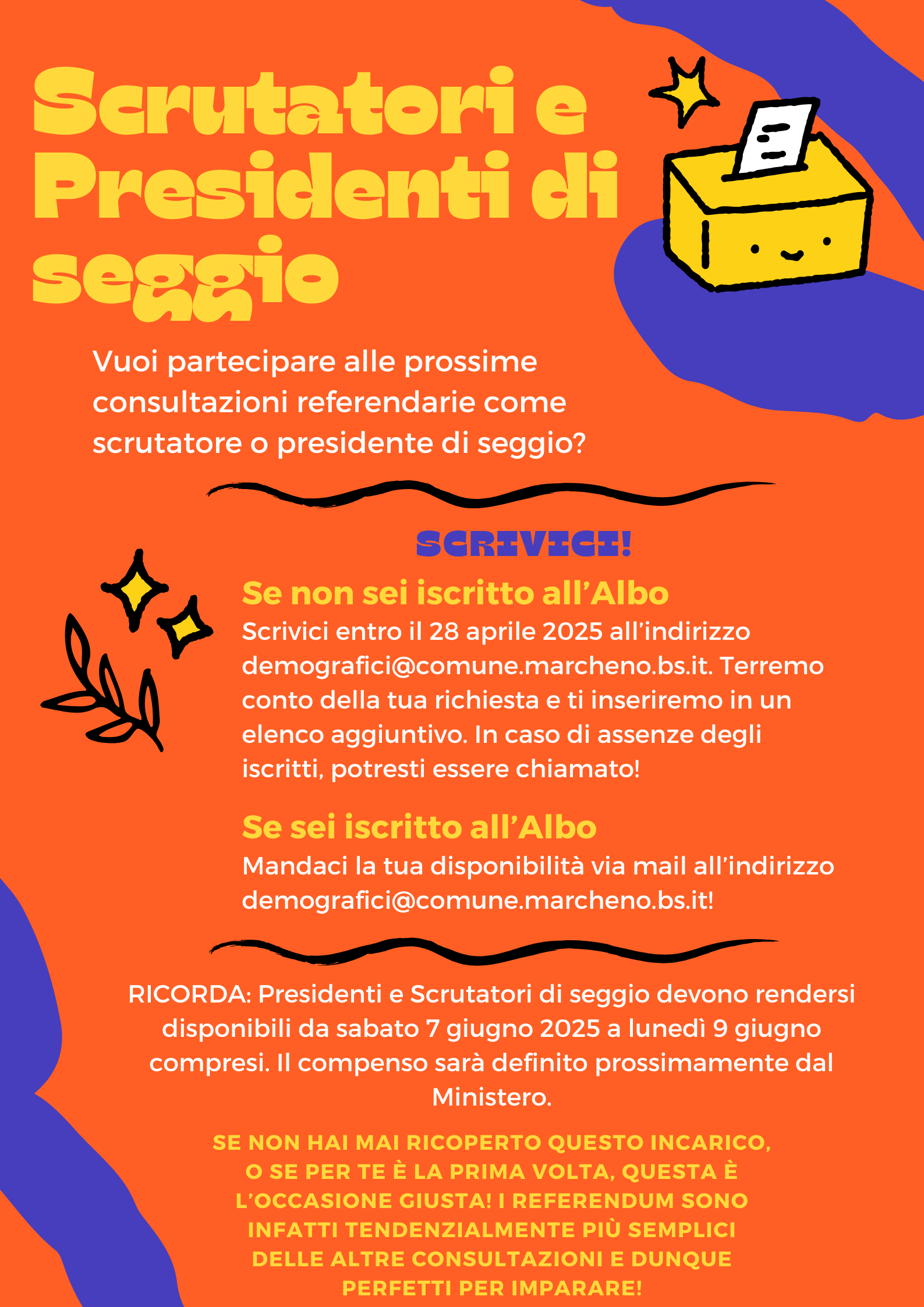 - non iscritto all'Albo: scarica il modulo presente qui sotto, compilalo e invia una mail all'indirizzo protocollo@pec.comune.marcheno.bs.it oppure demografici@comune.marcheno.bs.it allegando la copia di un documento di identità in corso di validità (entro il 28/04/2025)