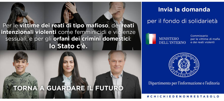La brochure "Lo Stato c'è, chi chiede non resta solo" è finalizzata a portare a conoscenza i benefici previsti in favore delle vittime di mafia, di femminicidio e di violenza sessuale e degli orfani dei crimini domestici, evidenziando che lo Stato è vicino, anche con un aiuto economico, alle vittime di tali efferati reati.