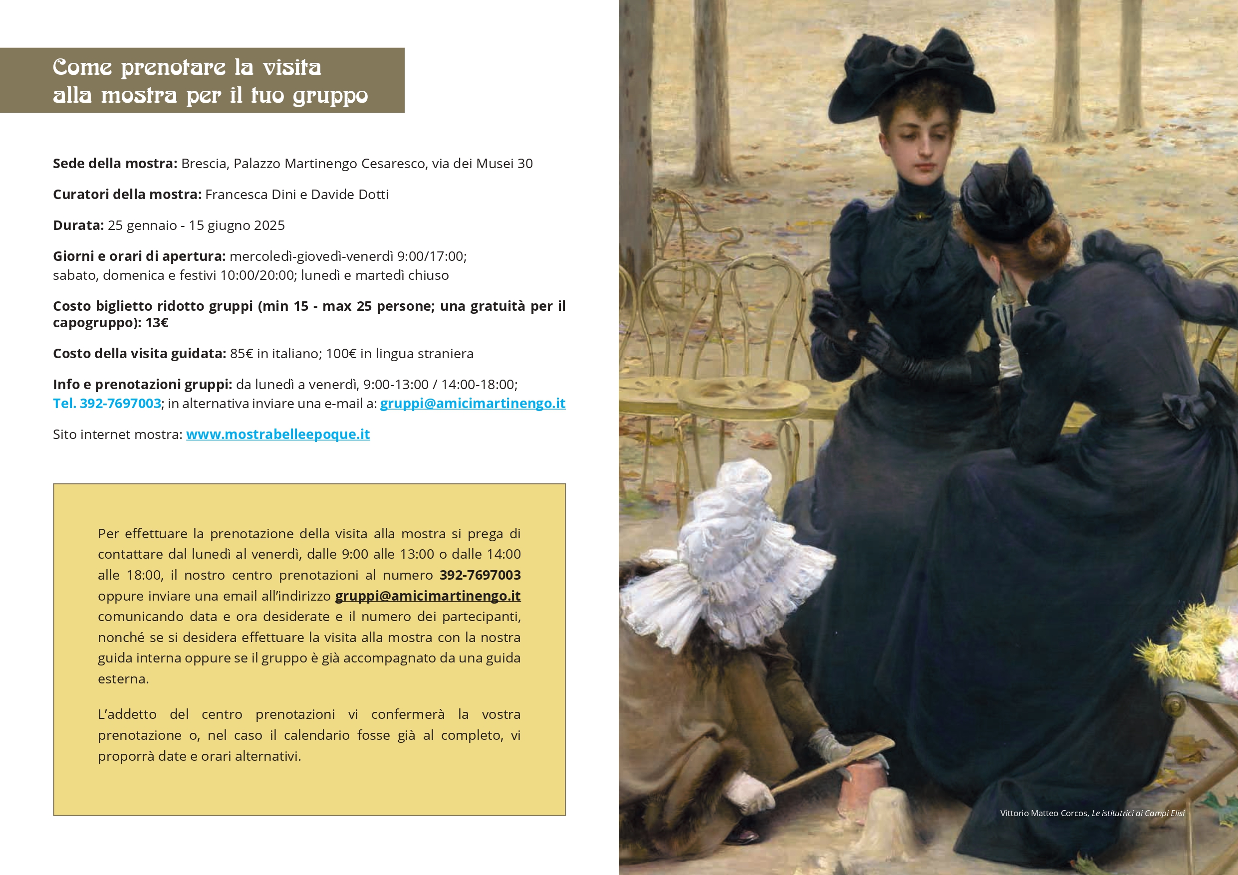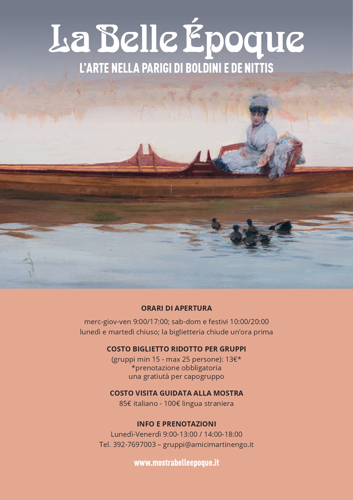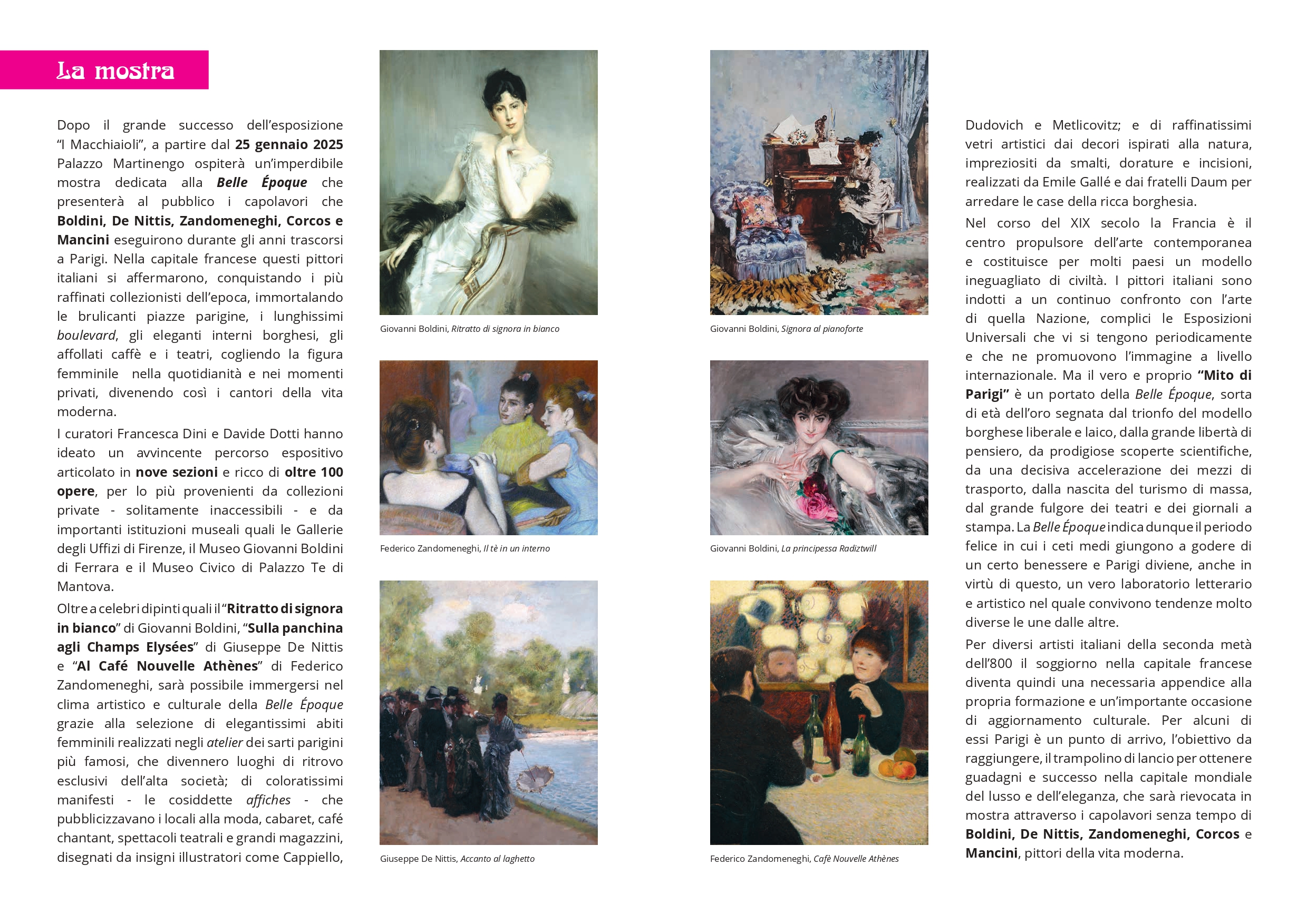 Dal 25 gennaio 2025 al 15 giugno 2025, presso Palazzo Martinengo a Brescia, si terrà l'iniziativa culturale della mostra "La Belle Époque. L’arte nella Parigi di Boldini e De Nittis”.
