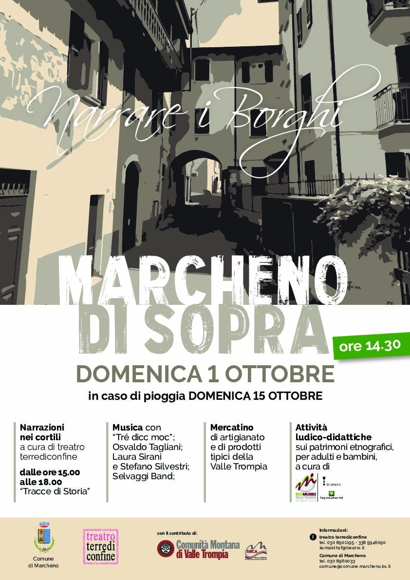 In data domenica 01/10/2023 il Comune di Marcheno ha raccontato le curiose e variegate storie del suo borgo Marcheno di Sopra. Il programma "Tracce di storia" prevedeva narrazioni nei cortili a cura di treatro terrediconfine a partire dalle ore 15.00 e fino alle ore 18.00. La giornata è stata allietata dalle musiche di del gruppo "Tré dicc moc", e di Osvaldo Tagliani, Laura Sirani e Stefano Silvestri, nonché la Selvaggi Band. Era inoltre presente un mercatino dell'artigianato e di prodotti tipici della Valle Trompia, e diverse attività ludico-didattiche sui patrimoni etnografici, sia per adulti, sia per bambini, a cura di EcoMuseo Valle Trompia.