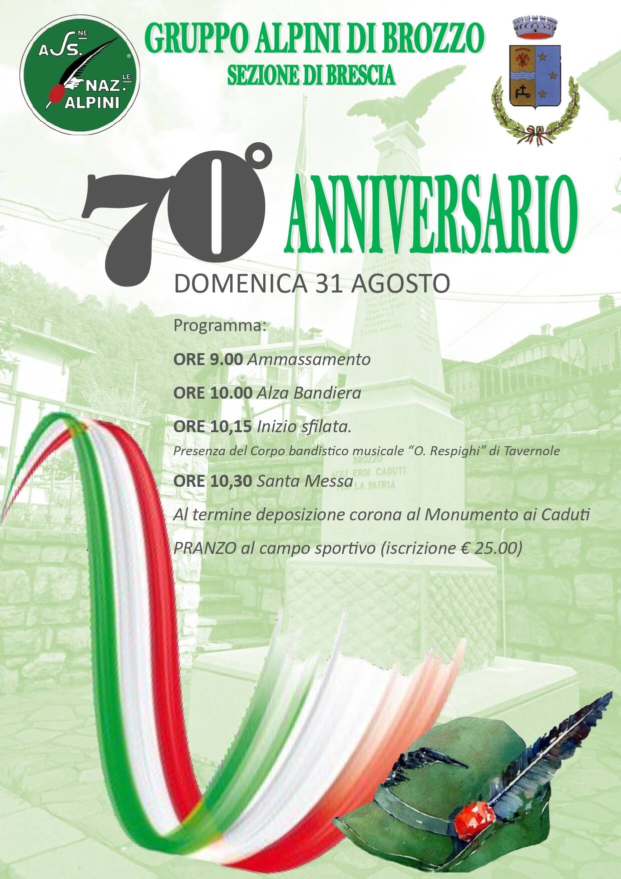 Domenica 31 agosto 2025 si terrà la celebrazione del 70° anniversario della fondazione del Gruppo Alpini di Brozzo.
