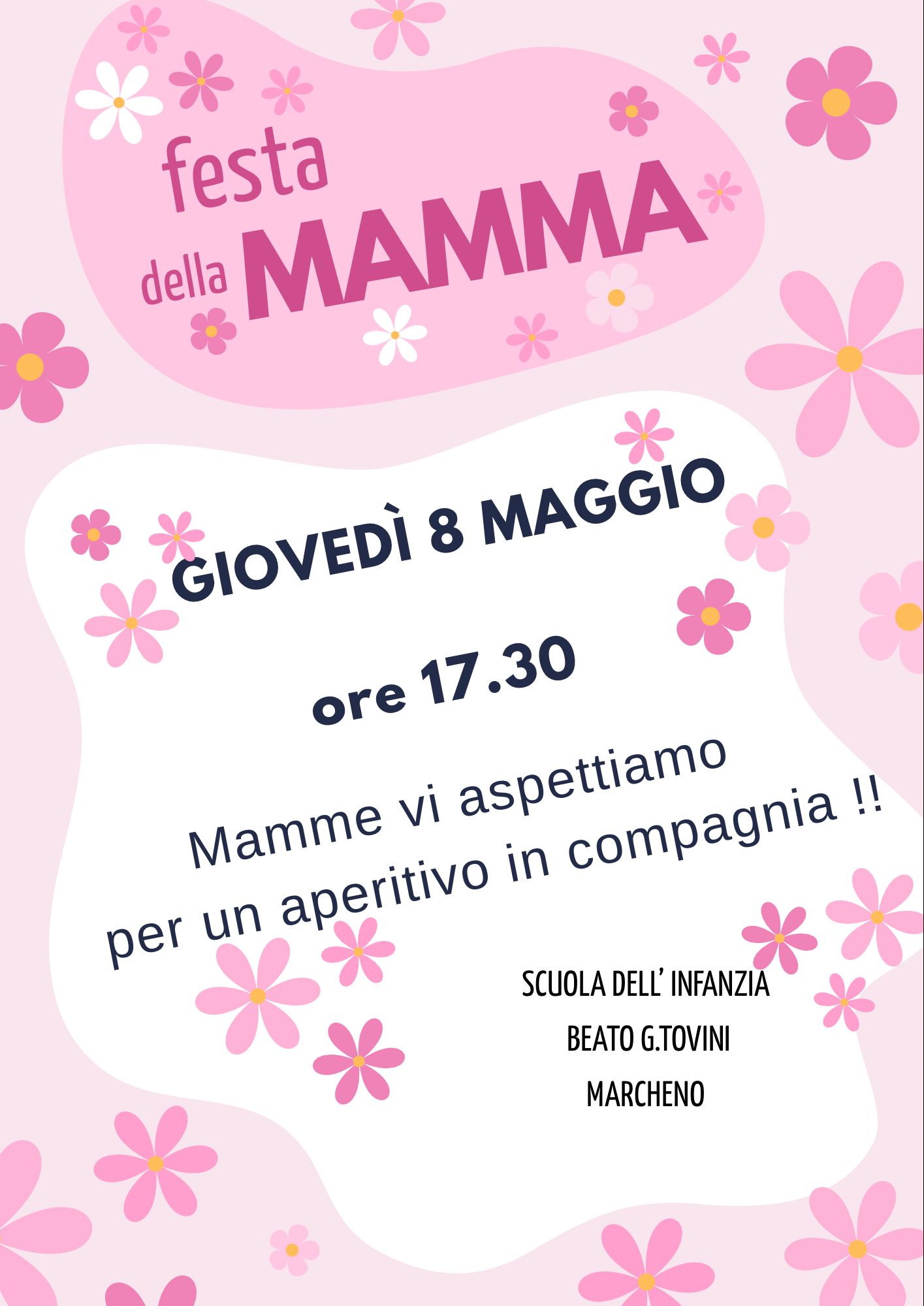 La scuola dell'infanzia Beato G. Tovini organizza, per giovedì 8 maggio 2025 alle ore 17:30, un aperitivo per festeggiare la festa della mamma.