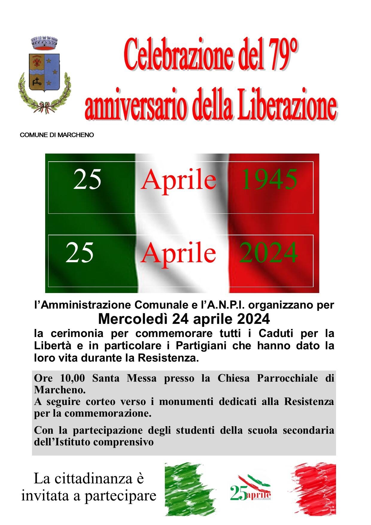 In vista del 25 Aprile, l'Amministrazione Comunale e l'A.N.P.I. organizzano mercoledì 24 aprile una cerimonia commemorativa dei Caduti e dei Partigiani.