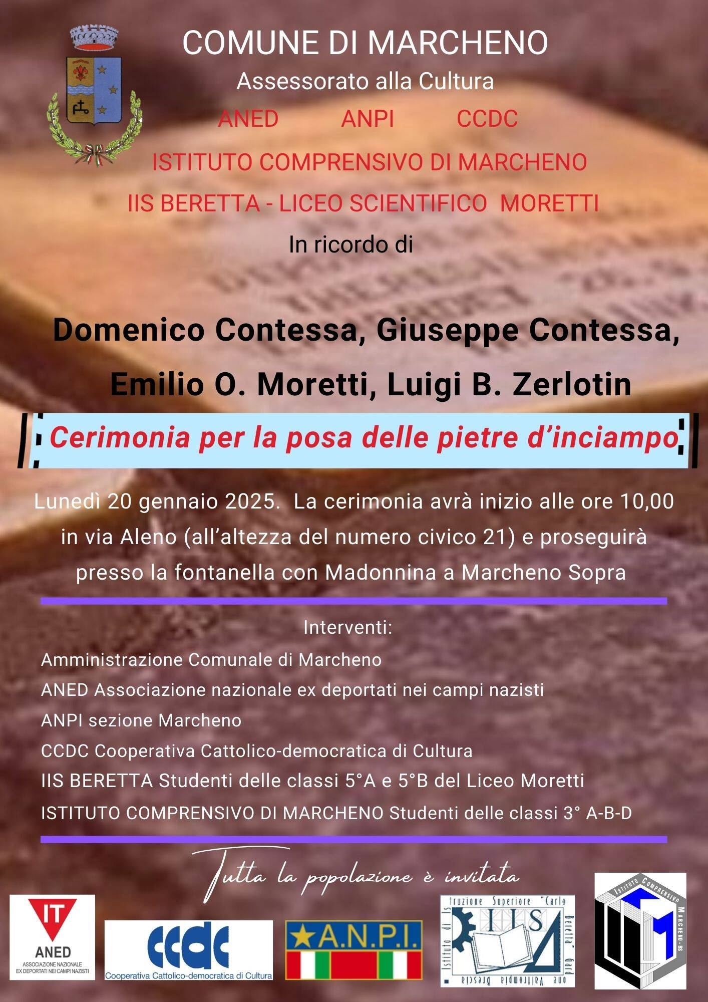 In ricordo di Domenico Contessa, Giuseppe Contessa, Emilio O. Moretti e Luigi B. Zerlotin, l'Assessorato alla Cultura, ANED, ANPI, CCDC, l'Istituto Comprensivo di Marcheno, l'IIS Beretta - Liceo Scientifico Moretti, lunedì 20 gennaio 2025, a partire dalle ore 10:00 terranno la cerimonia per la posa delle pietre d'inciampo.