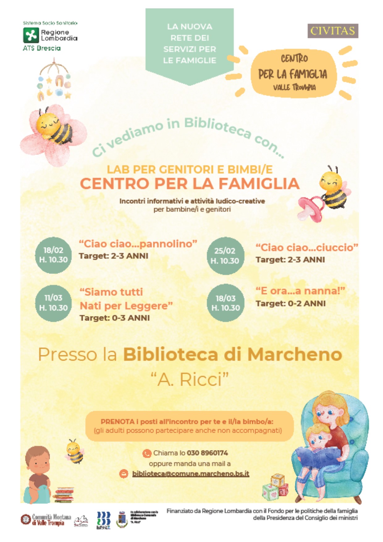 Il Centro per la Famiglia di Valle Trompia, in collaborazione con altri Enti del territorio, organizza per la giornata di martedì 25 febbraio, alle ore 10:30, un laboratorio per bimbi, bimbe e genitori presso la Biblioteca Civica Armando Ricci di Marcheno.