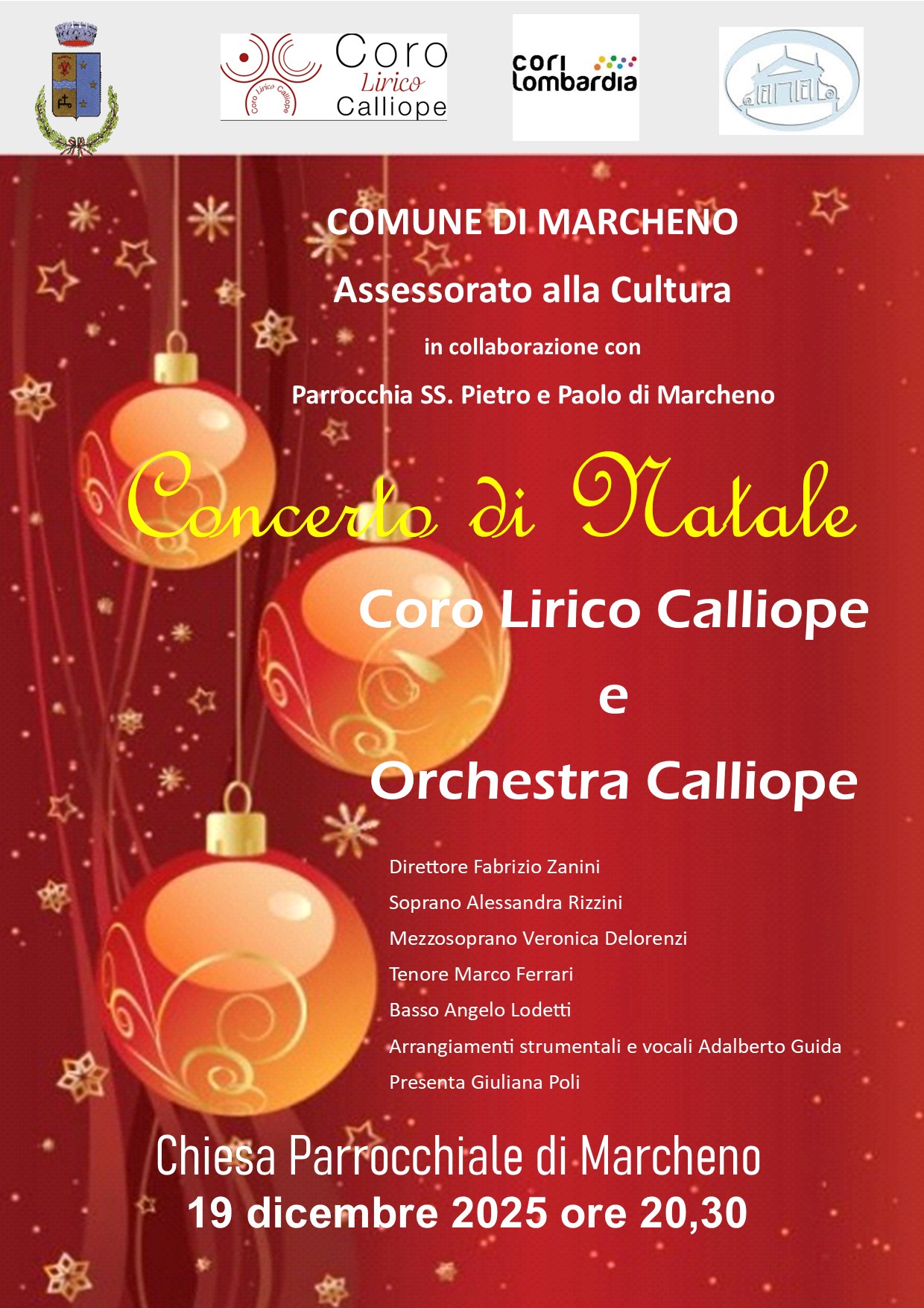 In data 19 dicembre 2025, alle or e20:30, presso la Chiesa Parrocchiale di Marcheno, si terrà un concerto natalizio a cura del Coro Lirico Calliope e dell'Orchestra Calliope.