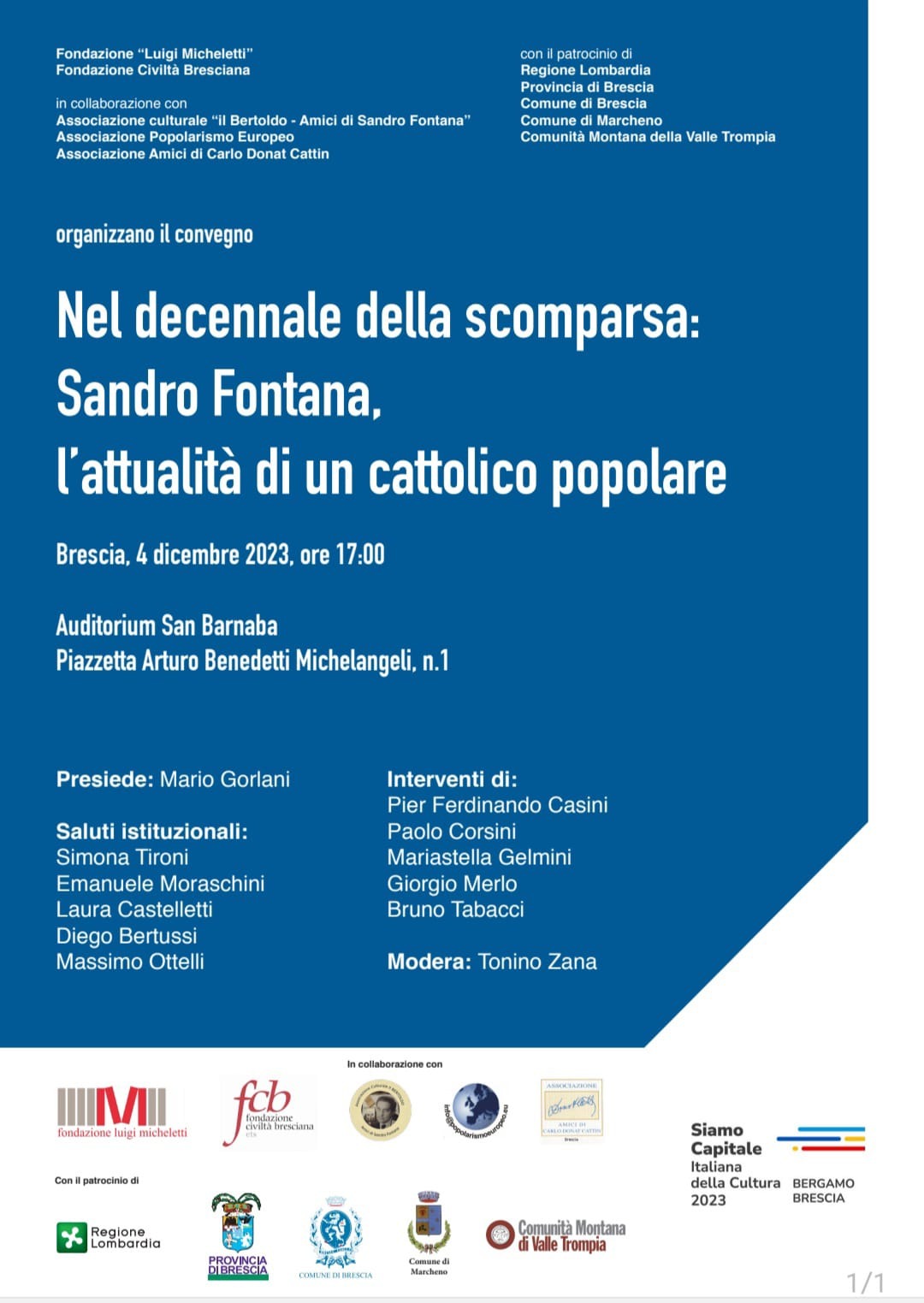 La Fondazione "Luigi Micheletti" e la Fondazione Civiltà Bresciana, con il patrocinio di Regione Lombardia, della Provincia di Brescia, del Comune di Brescia, del Comune di Marcheno e della Comunità Montana di Valle Trompia, organizzano un convegno in memoria di Sandro Fontana, a un decennio dalla sua scomparsa. L'incontro si terrà presso l'Auditorium San Barnaba, in Piazzetta Arturo Benedetti Michelangeli n.1 a Brescia in data lunedì 4 dicembre 2023 alle ore 17.00.