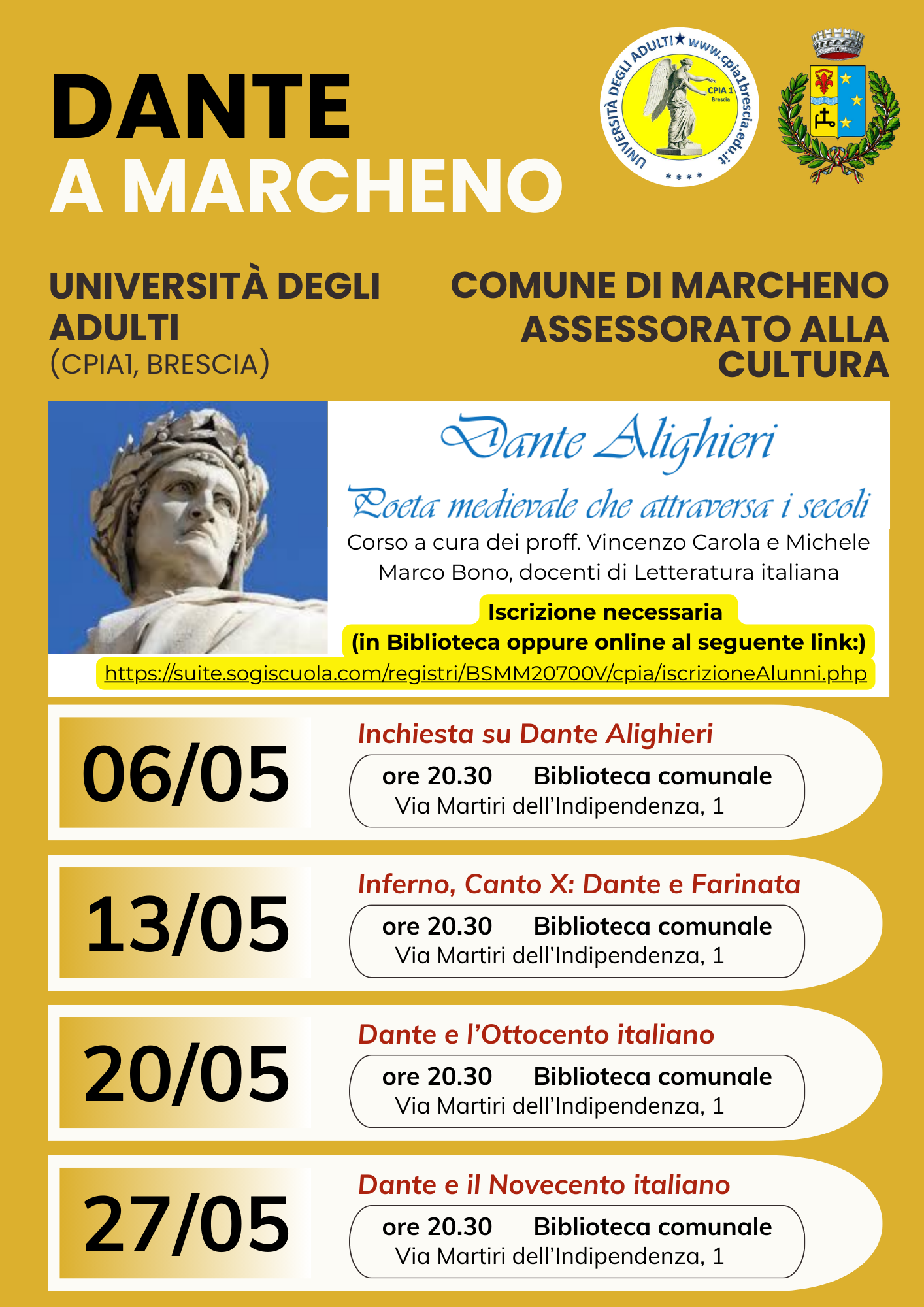 L'Assessorato alla Cultura di Marcheno organizza, in collaborazione con l'Università degli Adulti, un ciclo di quattro incontri formativi dedicati alla figura di Dante Alighieri, poeta medievale che attraversa i secoli e permea tutta la letteratura italiana degli ultimi secoli.