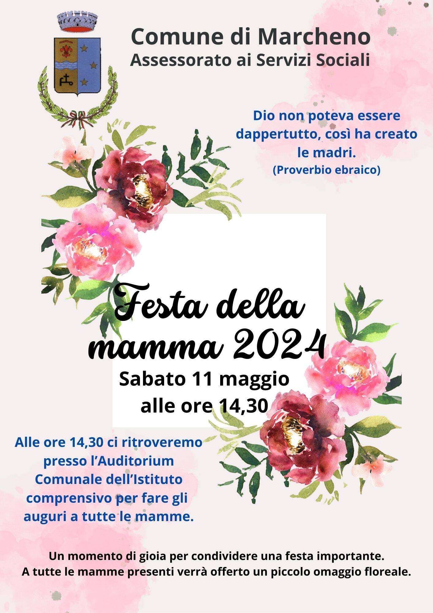 L'Assessorato ai Servizi Sociali organizza, presso l'Auditorium Comunale dell'Istituto Comprensivo, alle ore 14:30 di sabato 11 maggio 2024, un momento conviviale per fare gli auguri a tutte le mamme, a cui verrà offerto un piccolo omaggio floreale.