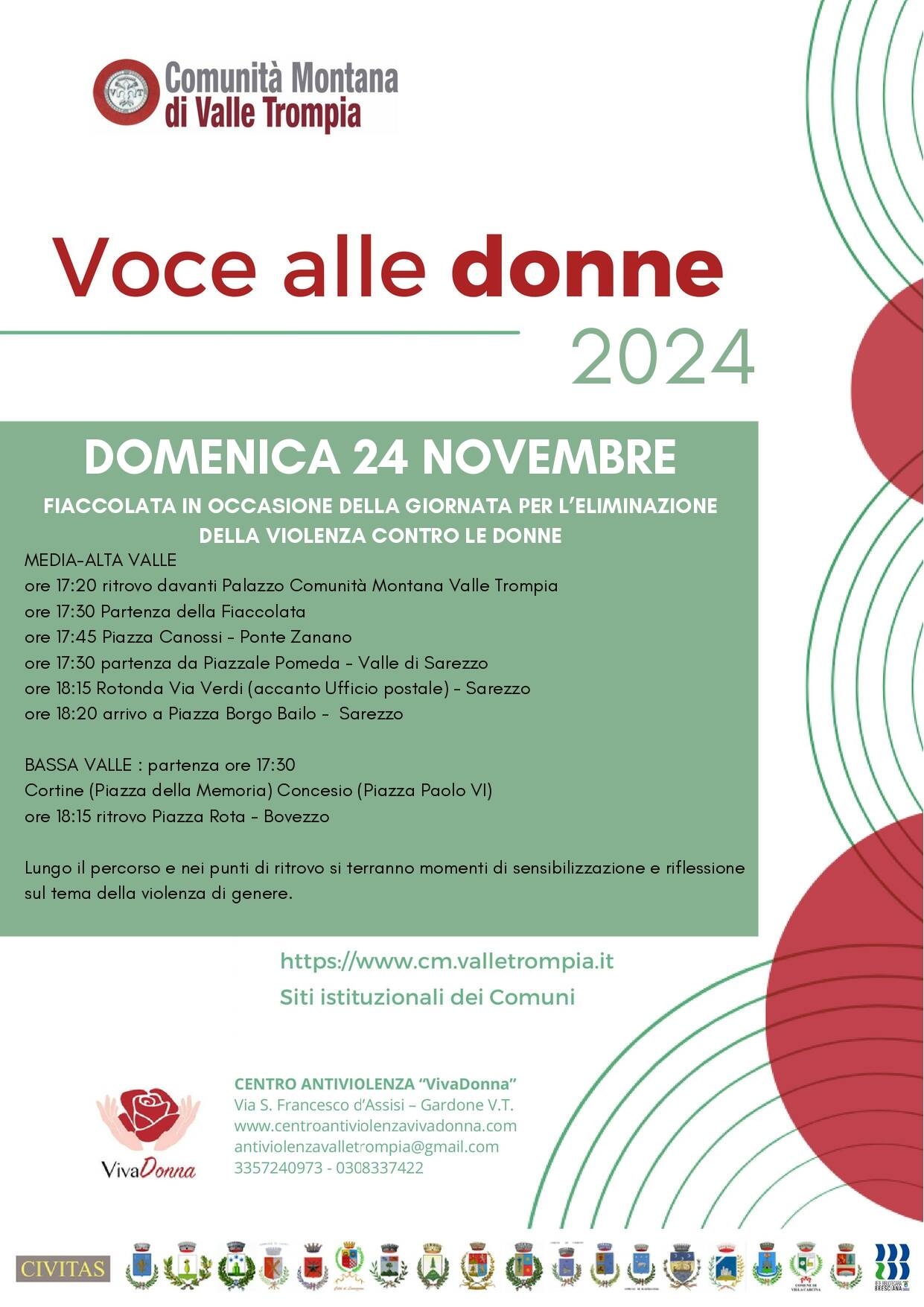 In occasione della giornata per l'eliminazione della violenza contro le donne, in data domenica 24 novembre si terrà una fiaccolata che coinvolgerà tutta la Valle Trompia. Lungo il percorso e nei punti di ritrovo si terranno momenti di sensibilizzazione e riflessione sul tema della violenza di genereb.