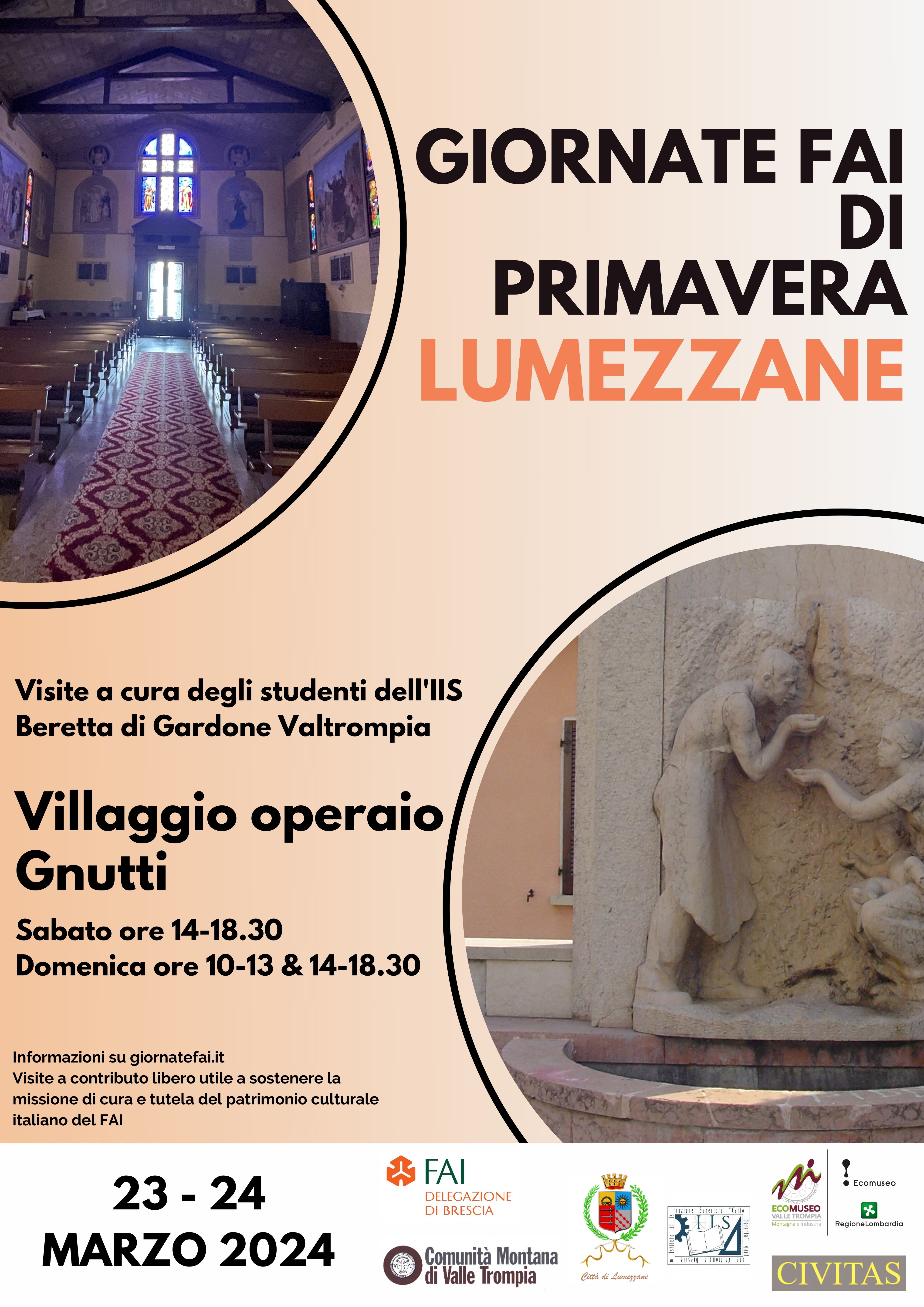 Comunità Montana di Valle Trompia e il Comune di Lumezzane organizzano due giornate culturali promosse a livello nazionale dal FAI, durante le quali sarà possibile scoprire parte del patrimonio storico, culturale e architettonico della Valle Trompia, visitando il Villaggio Gnutti, villaggio operaio realizzato dalla nota famiglia di imprenditori proprietari dell’omonima ditta lumezzanese sul finire degli anni ’30 del Novecento.