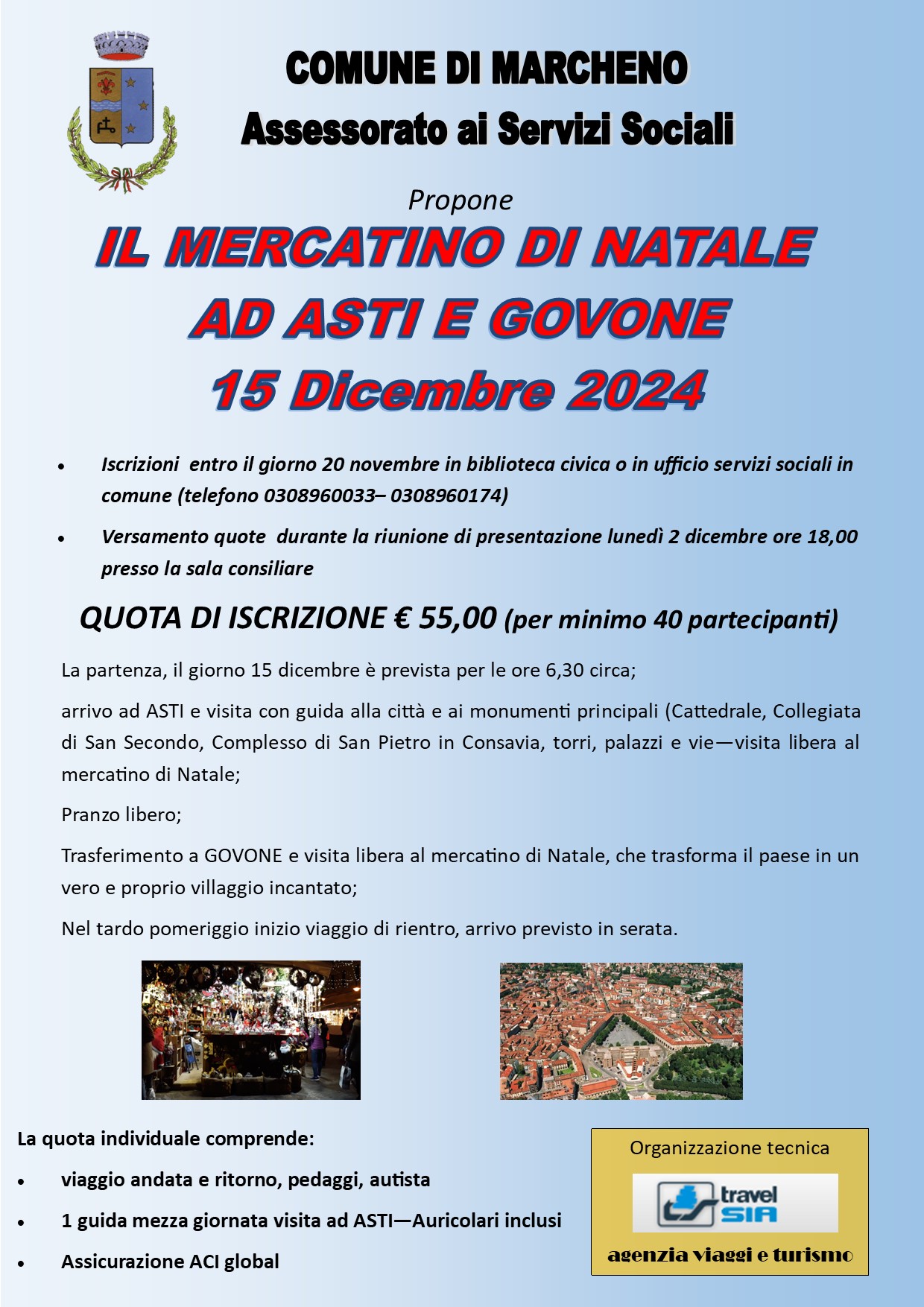 L'Amministrazione Comunale di Marcheno propone per il giorno 15 dicembre 2024 una gita presso i mercatini di Natale di Asti e Govone.