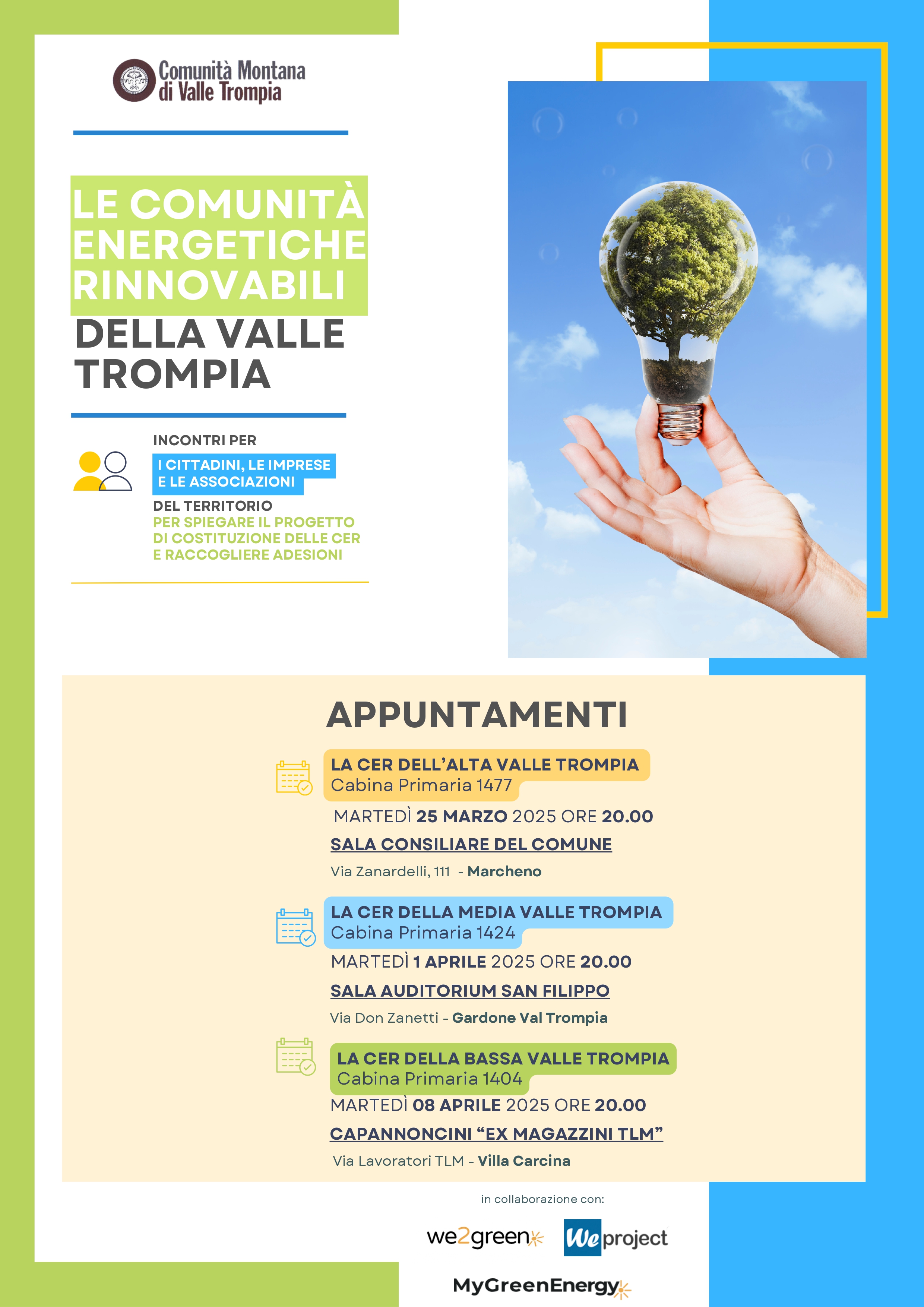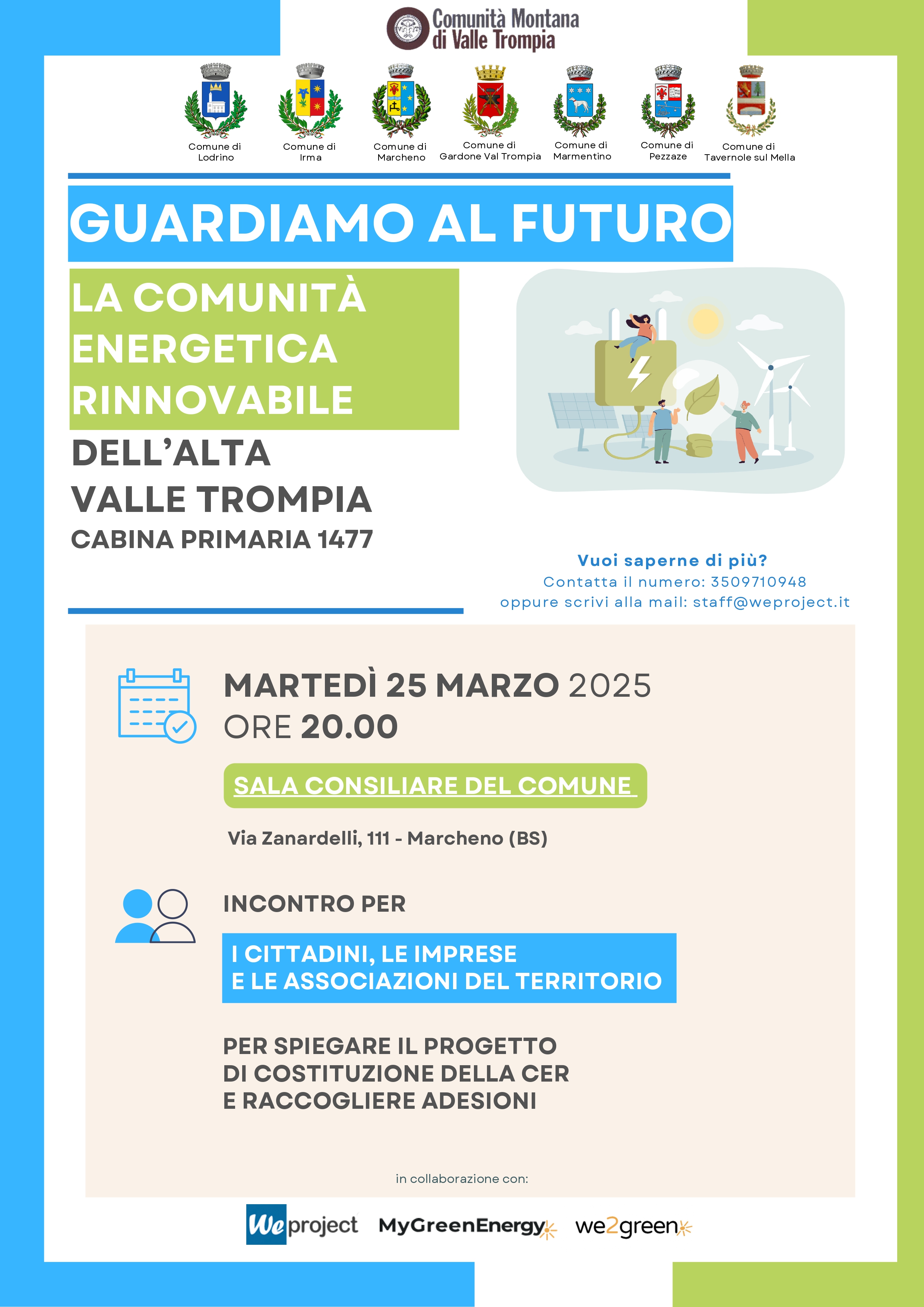 Martedì 25/03/2025 alle ore 20:00 si terrà, presso la Sala Consiliare del Comune, un'incontro rivolto ai cittadini, alle imprese e alle associazioni del territorio interessati al progetto della CER (Comunità Energetica Rinnovabile) della Valle Trompia.