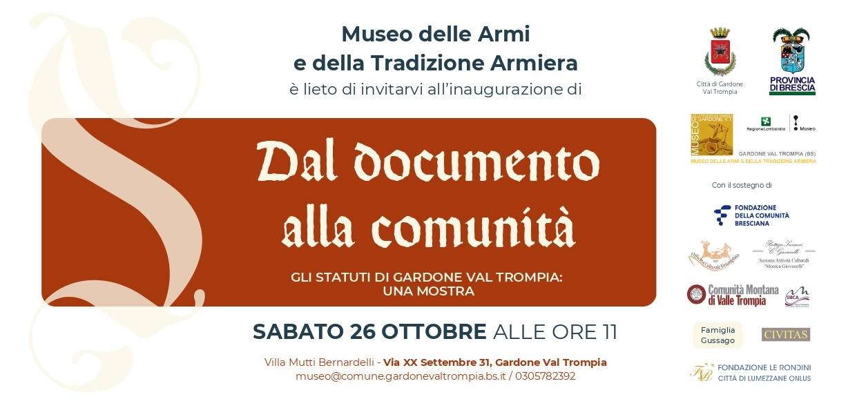Sabato 26 ottobre alle ore 11:00 si inaugura la mostra "Dal documento alla comunità. Gli statuti di Gardone Val Trompia", che attraverso documenti originali e le riproduzioni di alcune pagine degli Statuti del Comune di Gardone del 1456 intende raccontare un mondo sociale che rappresenta le radici dei recenti sviluppi comunali del Comune di Gardone Val Trompia.