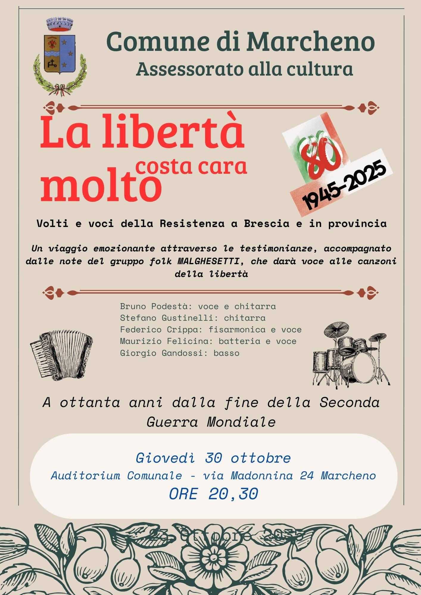 A circa ottant'anni dalla fine della seconda guerra mondiale, il Comune di Marcheno narrerà volti e voci della Resistenza a Brescia e in Provincia. Per la serata del 30 ottobre 2025, infatti, è stato organizzato dall'Assessorato alla Cultura un viaggio emozionante attraverso le testimonianze storiche della Resistenza bresciana, accompagnato dalle note del gruppo folk Malghesetti, che darà voce alle canzoni della libertà.