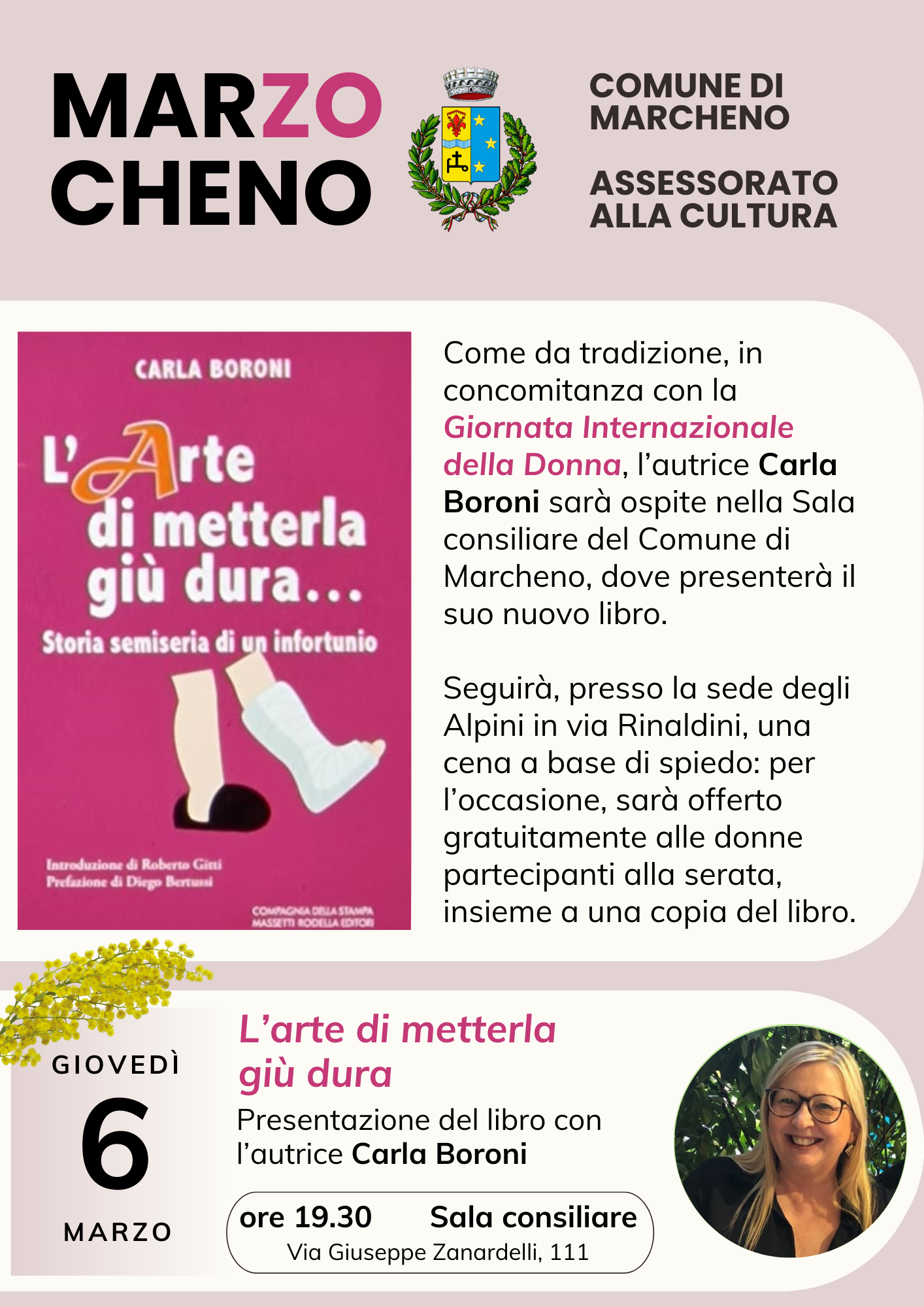 Giovedì 6 marzo 2025, alle ore 19:30, presso la Sala Consiliare di Marcheno, l'Assessorato alla Cultura propone una serata letteraria dedicata alla presentazione del libro di Carla Boroni, intitolato "L'arte di metterla giù dura".