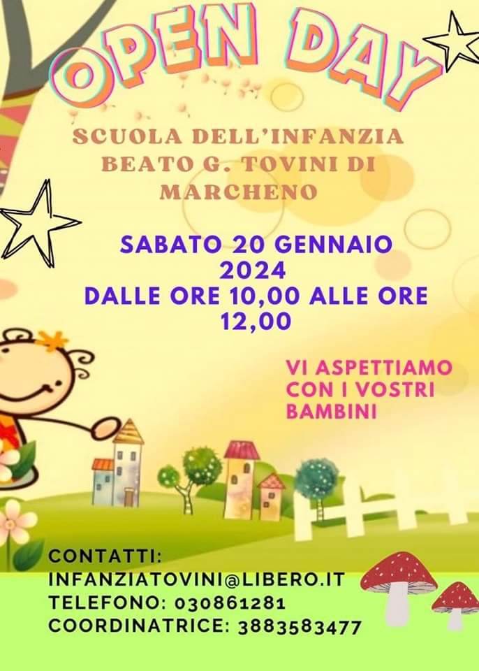 La Scuola dell'Infanzia Beato G. Tovini in data 20 gennaio 2024 dalle ore 10.00 alle ore 12.00 organizza un open day per bimbi e genitori al fine di conoscere l'offerta formativa, l'ambiente e gli insegnanti.