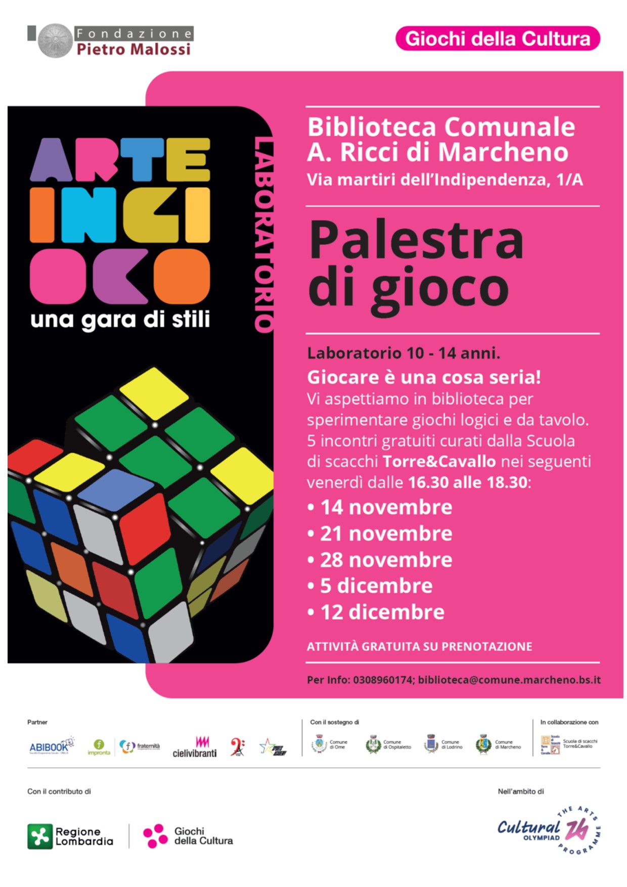 Presso la Biblioteca "Armando Ricci" di Marcheno, a partire dal 14 novembre e per tutti i venerdì fino al 12 dicembre, si terranno una serie di laboratori gratuiti curati dalla Scuola di Scacchi "Torre & Cavallo", rivolti a ragazzi con un'età compresa tra i 10 e i 14 anni.