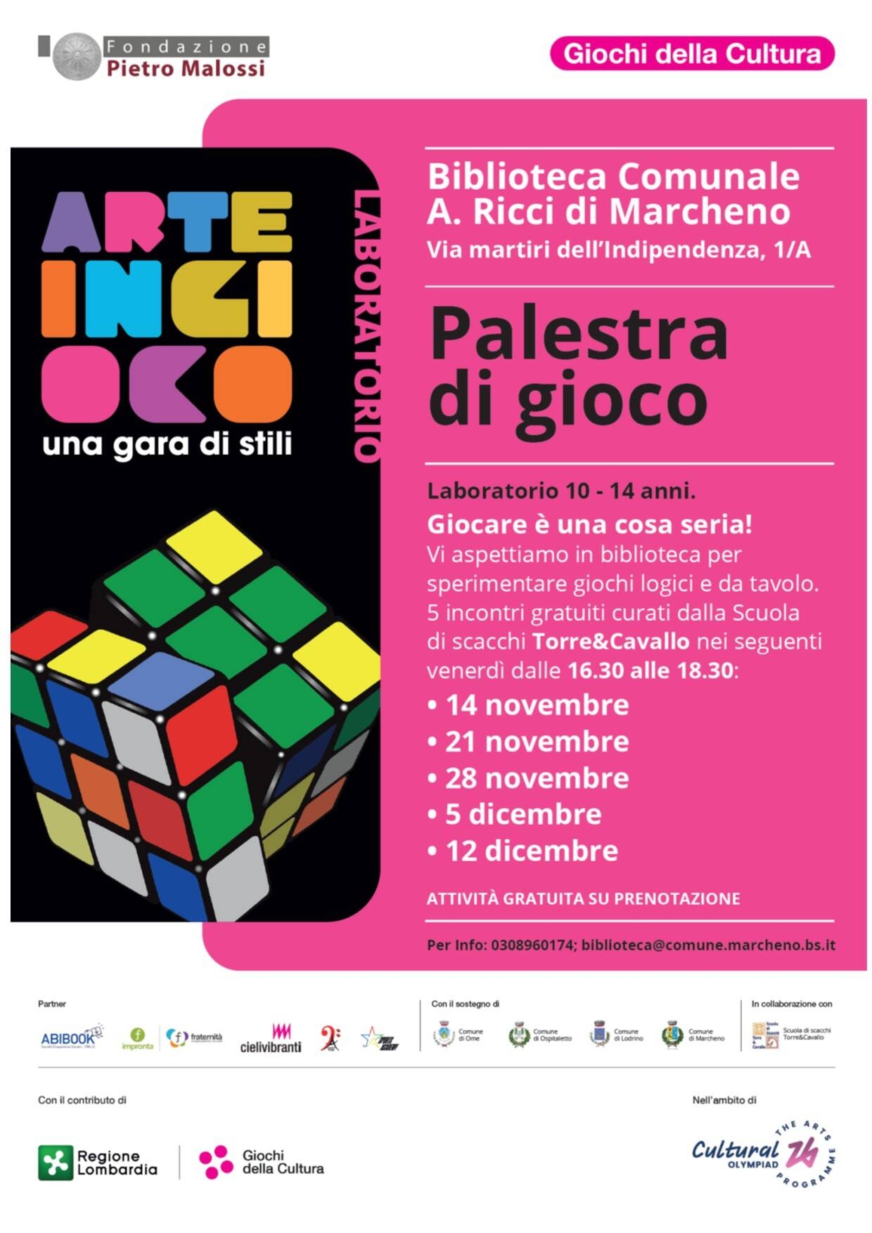 Presso la Biblioteca "Armando Ricci" di Marcheno, a partire dal 14 novembre e per tutti i venerdì fino al 12 dicembre, si terranno una serie di laboratori gratuiti curati dalla Scuola di Scacchi "Torre & Cavallo", rivolti a ragazzi con un'età compresa tra i 10 e i 14 anni.