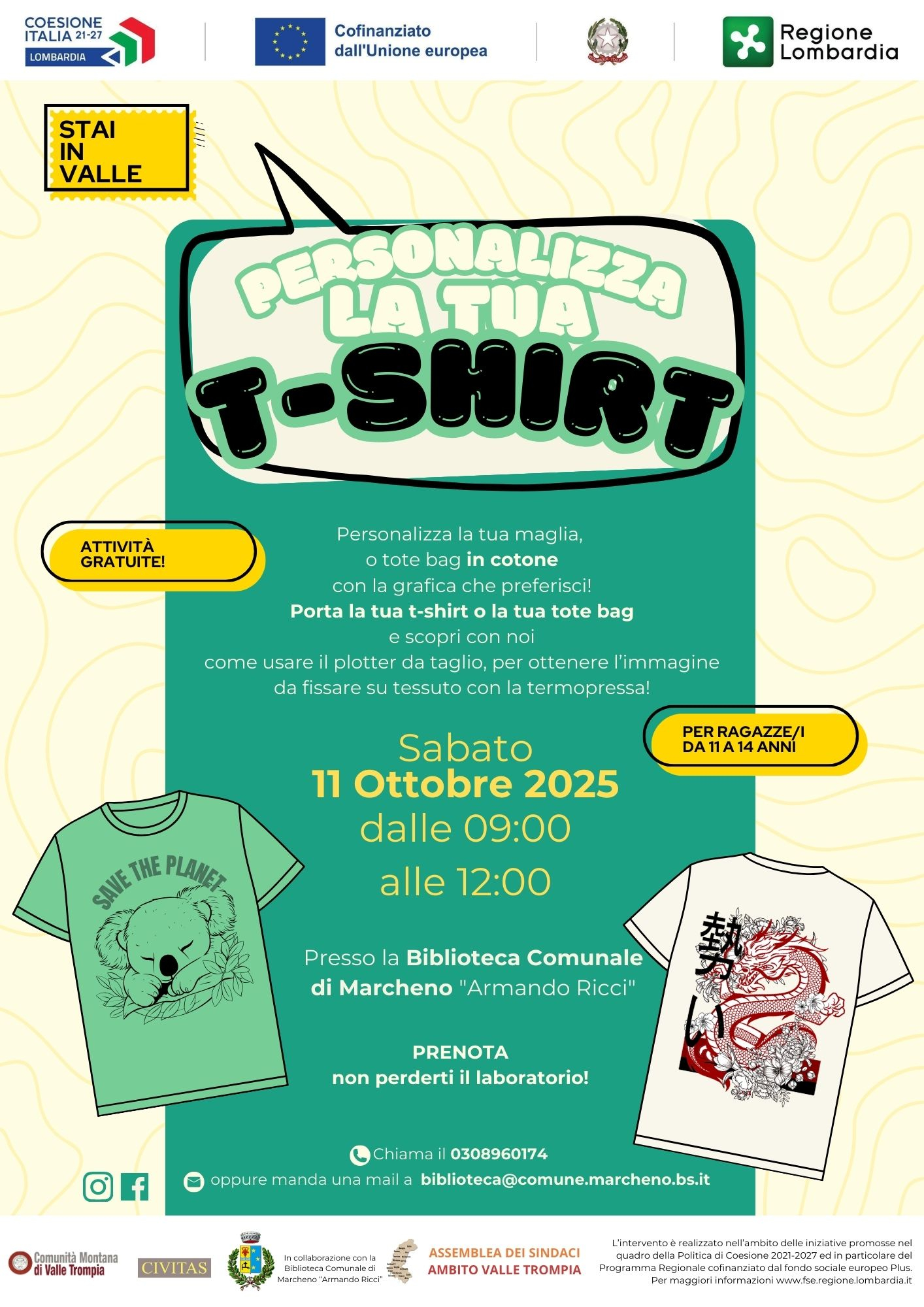 Sabato 11 ottobre, dalle 09:00 alle 12:00, presso la Biblioteca Comunale "Armando Ricci", si terrà l'evento "Personalizza la tua t-shirt", nel quale ti sarà possibile decorare con la grafica che più preferisci la tua t-shirt o la tua tote bag.