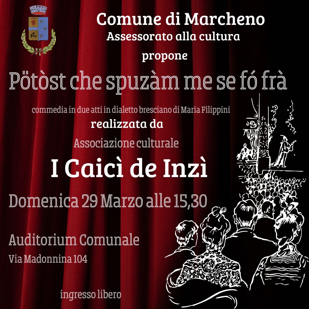Domenica 29 marzo 2026, alle ore 15:30 presso l'Auditorium Comunale, sito in Via Madonnina 104, l'Assessorato alla Cultura del Comune di Marcheno propone una commedia in due atti realizzata dall'Associazione culturale I Caicì de Inzì, dal titolo: "Pötòst che spuzàm me se fó frà".