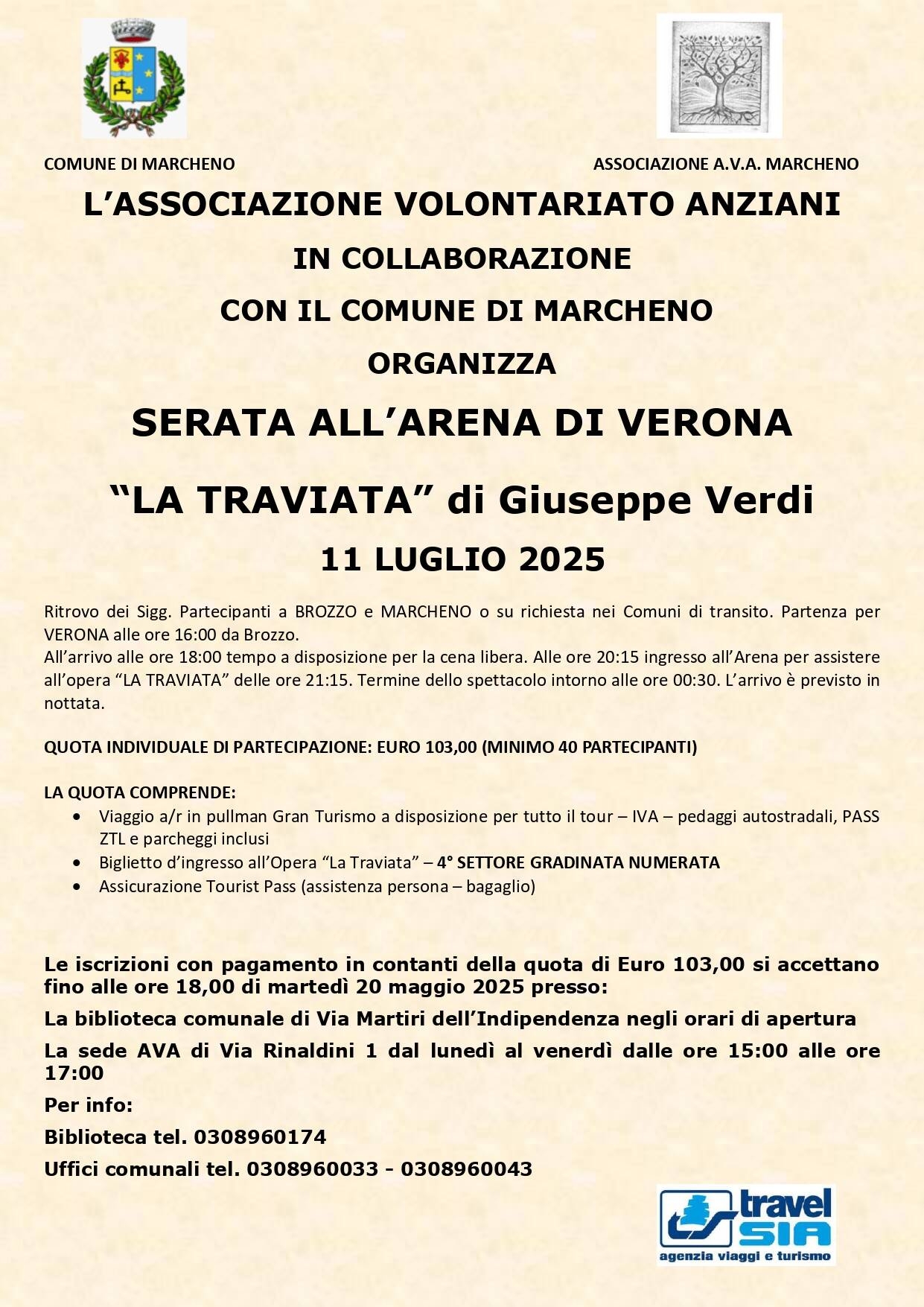 Il Comune di Marcheno e l'Associazione Volontariato Anziani organizzano, per la serata di venerdì 11 luglio, un viaggio all'Arena di Verona per poter assistere all'opera "La Traviata" di Giuseppe Verdi.