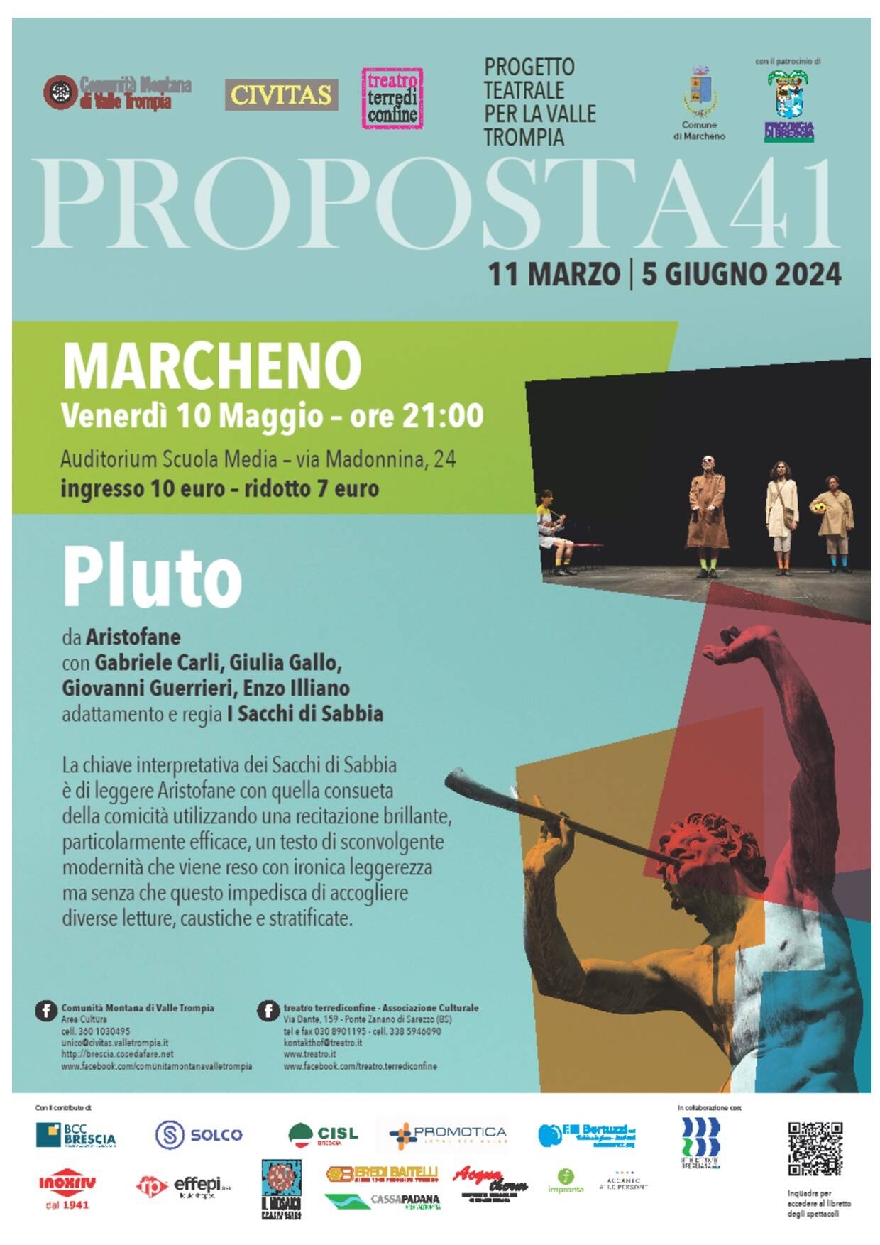 Proposta41 per la serata di venerdì 10 maggio 2024, alle ore 21:00, presso l'Auditorium Comunale, mette in scena la commedia di Aristofane "Pluto". L'adattamento e la regia sono a cura di "I Sacchi di Sabbia". Con la partecipazione di Gabriele Carli, Giulia Gallo, Giovanni Guerrieri, Enzo Illiano.