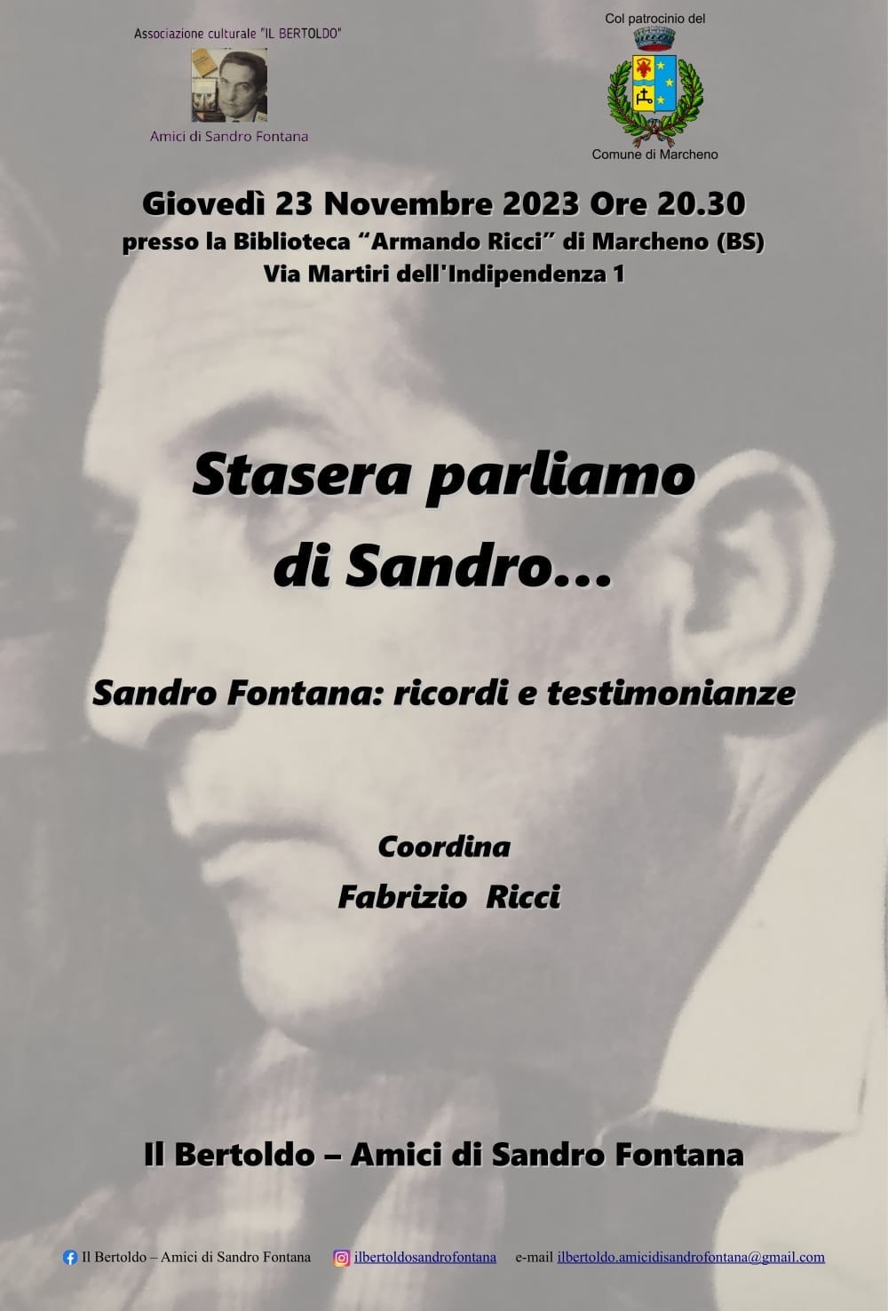 Giovedì 23 novembre 2023 alle ore 20.30, presso la Biblioteca Civica "Armando Ricci" si terrà un incontro in memoria di Sandro Fontana, con il coordinamento di Ricci Fabrizio. L'evento è patrocinato dal Comune di Marcheno.