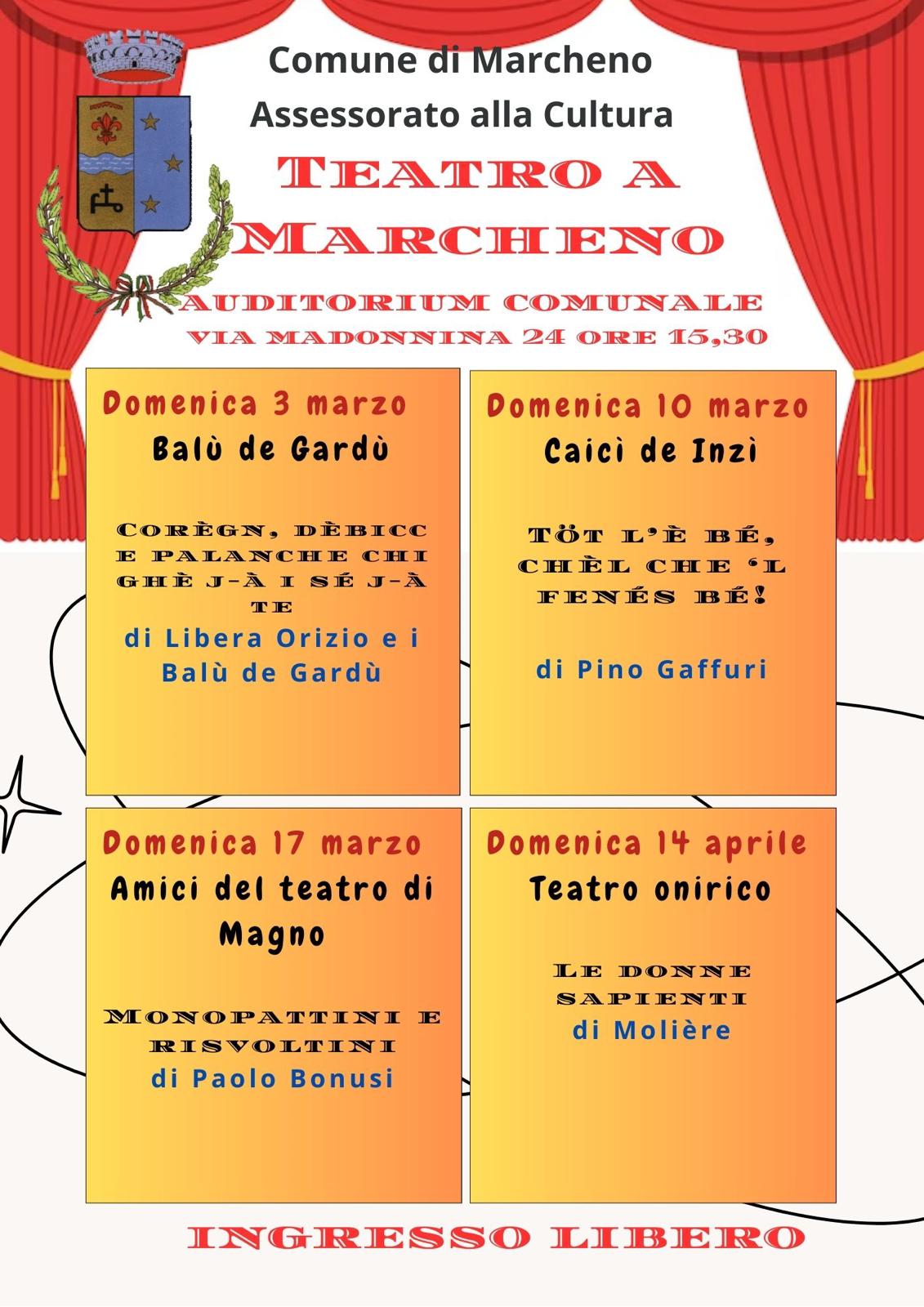 Domenica 3 marzo, domenica 10 marzo, domenica 17 marzo e domenica 14 aprile alle ore 15:30 presso l'Auditorium Comunale di Via Madonnina si terrà un ciclo di spettacoli, di cui alcuni in dialetto bresciano, decisamente made in Brescia, e altri presi dalla tradizione letteraria.