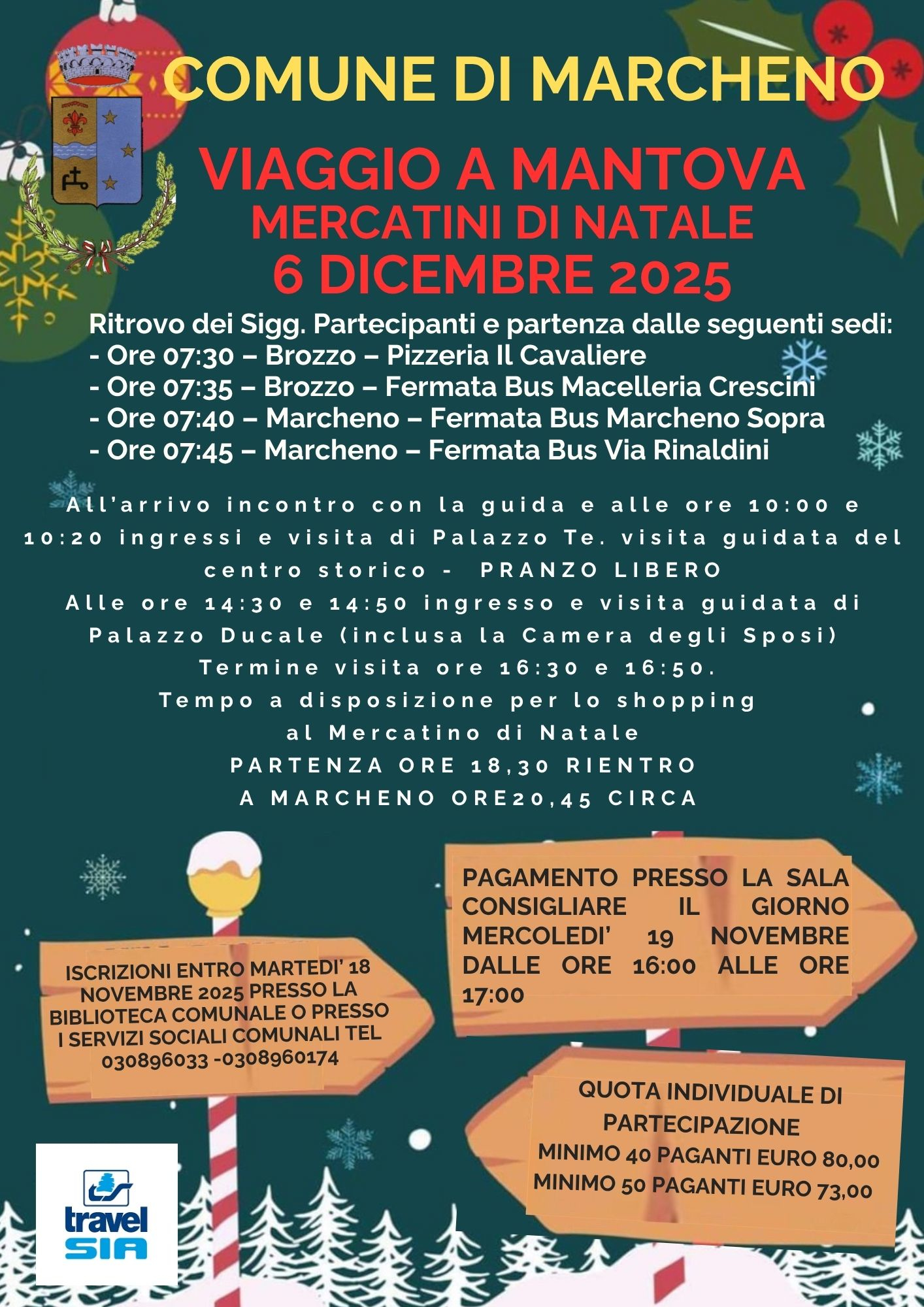Per sabato 6 dicembre 2025, il Comune di Marcheno porta un po' di Natale con la gita organizzata ai mercatini di Mantova.