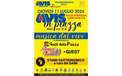 Le AVIS di Lumezzane, Bovegno, Brozzo, Gardone V.T., Lodrino, Lavone, Pezzaze, Polaveno-Brione, Sarezzo, Tavernole s/M, Villa Carcina organizzano, in data Giovedì 11 Luglio alle ore 19.30 presso Piazza Portegaia a Lumezzane, ValtrompiAvis Fest 2024.